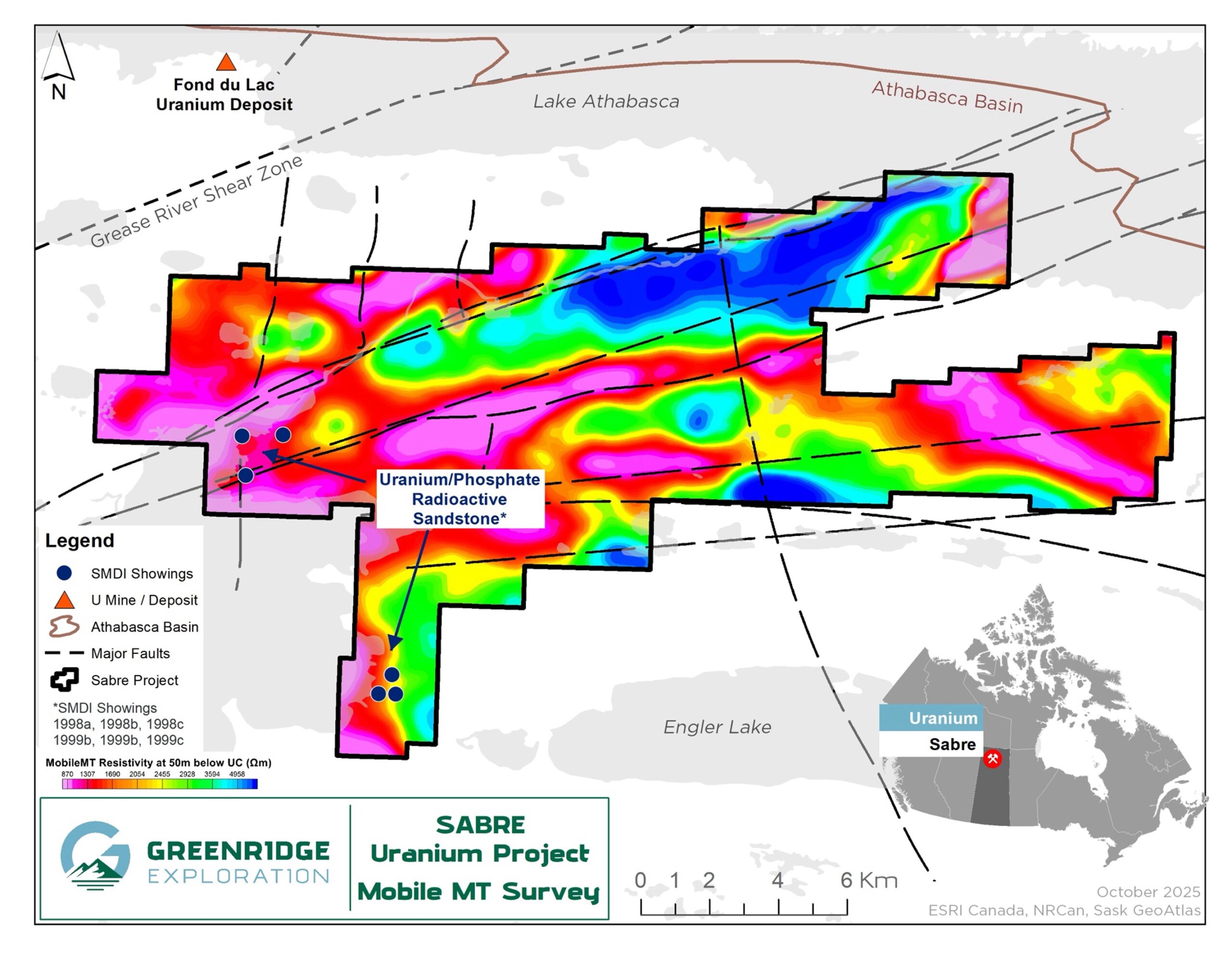 On October 25, 2022 Greenridge announced the completion of a prospecting program at Sabre. Two radioactive zones were located on surface in the Athabasca sandstone by Greenridge’s prospecting team adjacent to an interpreted structural zone of quartz vein brecciation.